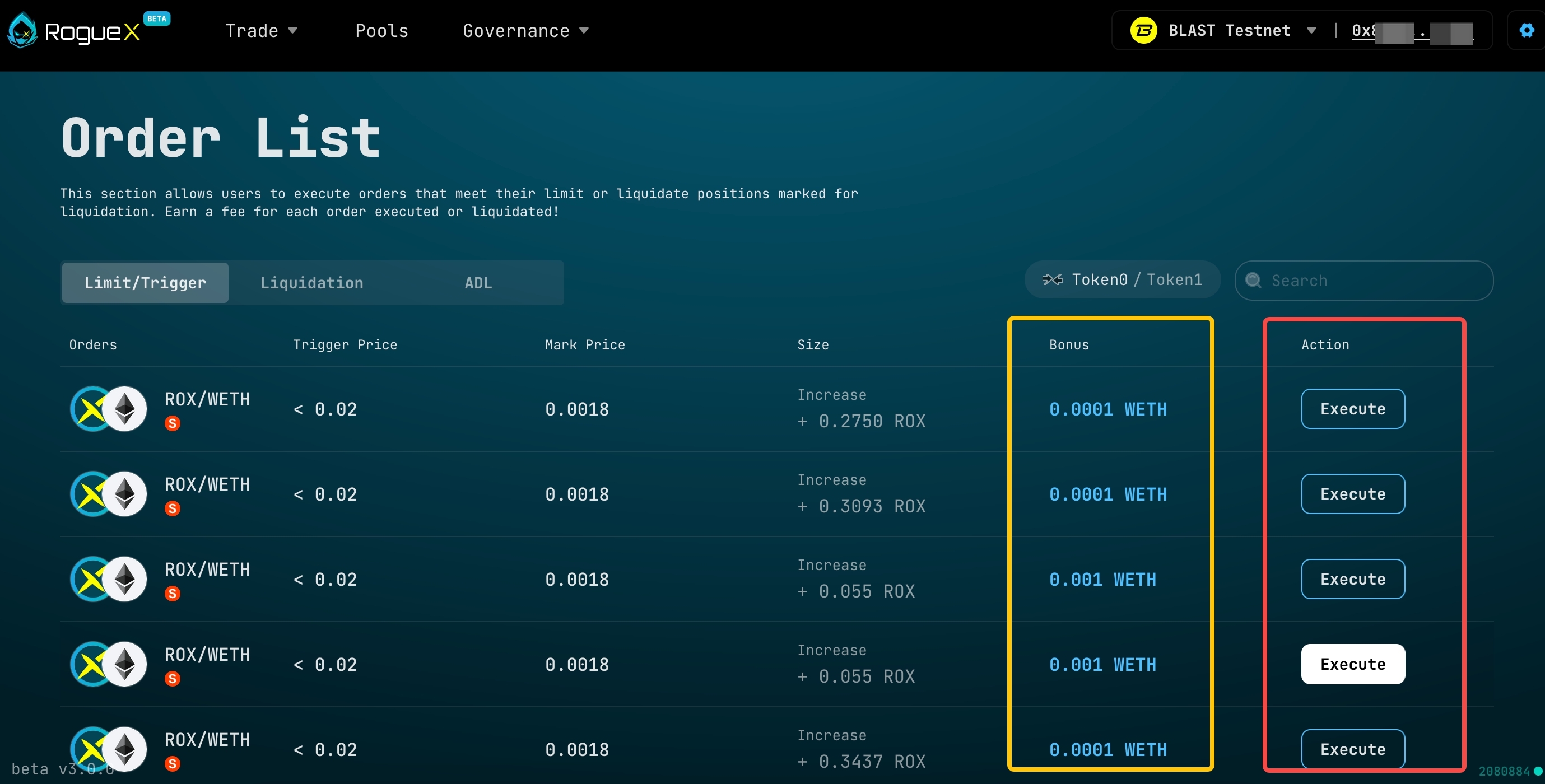 1. Navigate to the "Trade > Order List" section. This section enables users to execute orders that meet their specified limits or liquidate positions marked for liquidation, earning a fee for each order executed or position liquidated.
